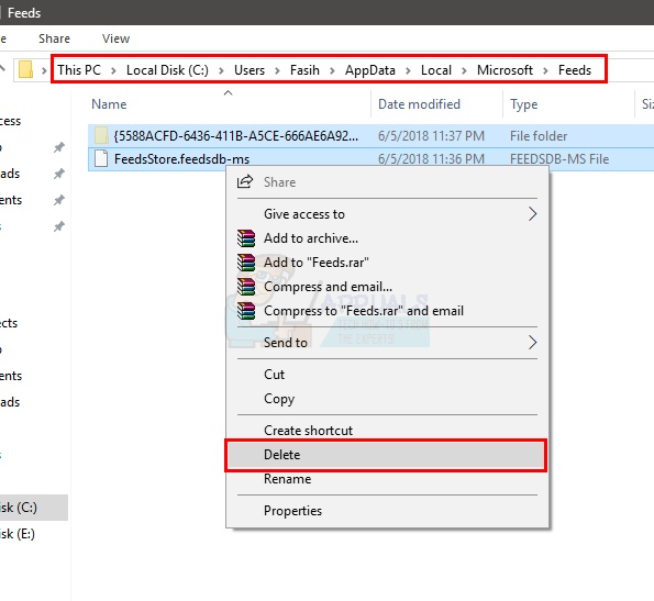 - Type C:\Users\Your username\AppData\Local\Microsoft\Feeds in the address bar located at the top and press Enter. Note: Replace Your username with your actual username. You can also just simply navigate to this location by going to C drive -> double click Users -> double click “your username folder” -> double click AppData -> double click Local -> double click Microsoft -> double click Feeds. Note: In Windows XP, the location of feeds will be %userprofile%\Local Settings\Application Data\Microsoft\Feeds. In Windows Vista, the feeds folder will be %LOCALAPPDATA%\Microsoft\Feeds. Simply copy paste these addresses in the address bar.