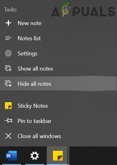 - Right-click on any of the Sticky Notes windows on the Taskbar of your system and select Hide All Notes (You can also try CTRL + O keyboard shortcut).