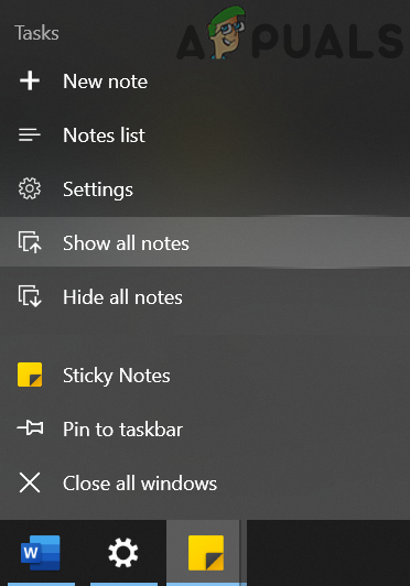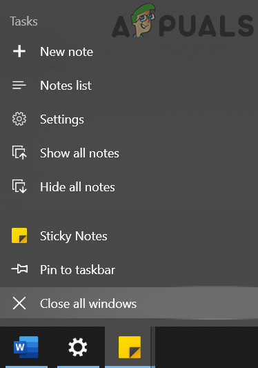 - Right-click on any of the Sticky Notes window on the Taskbar of your system and choose Close All Windows.