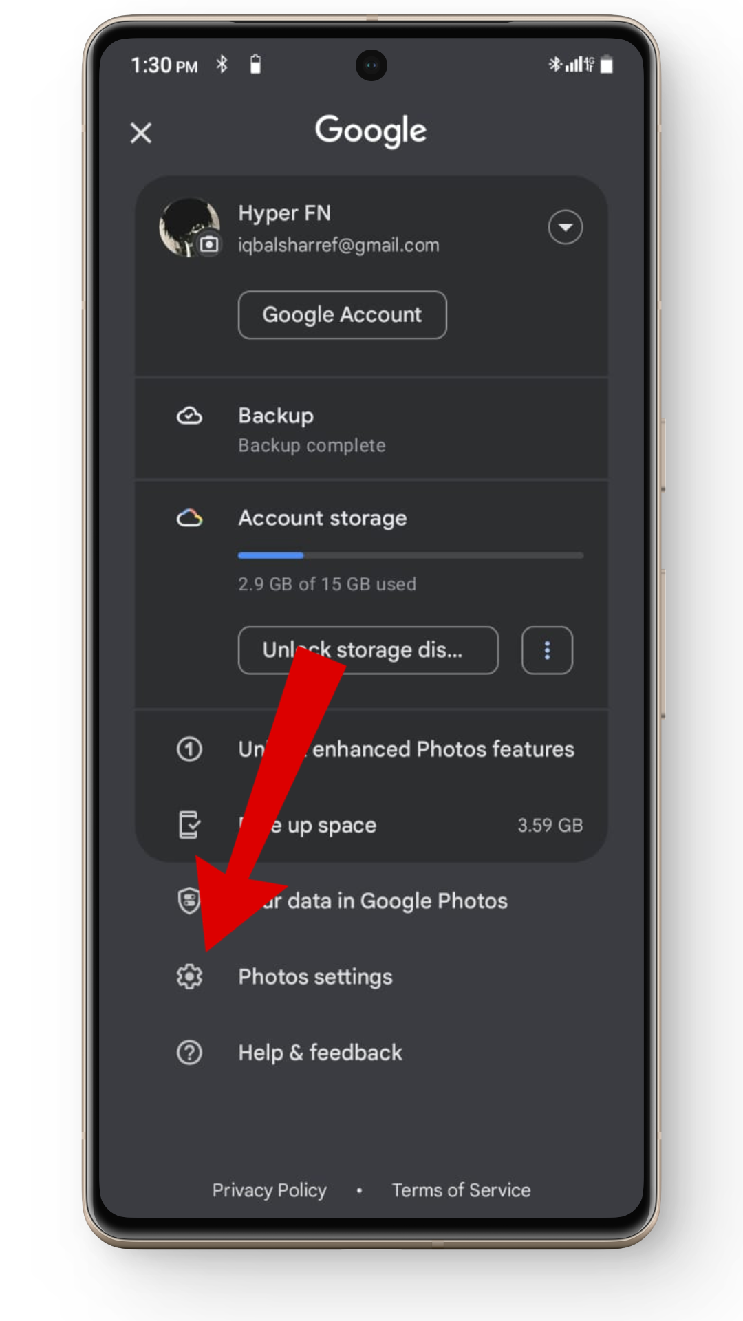 Select the Google Photos settings - Tap on the Backup option at the top.
