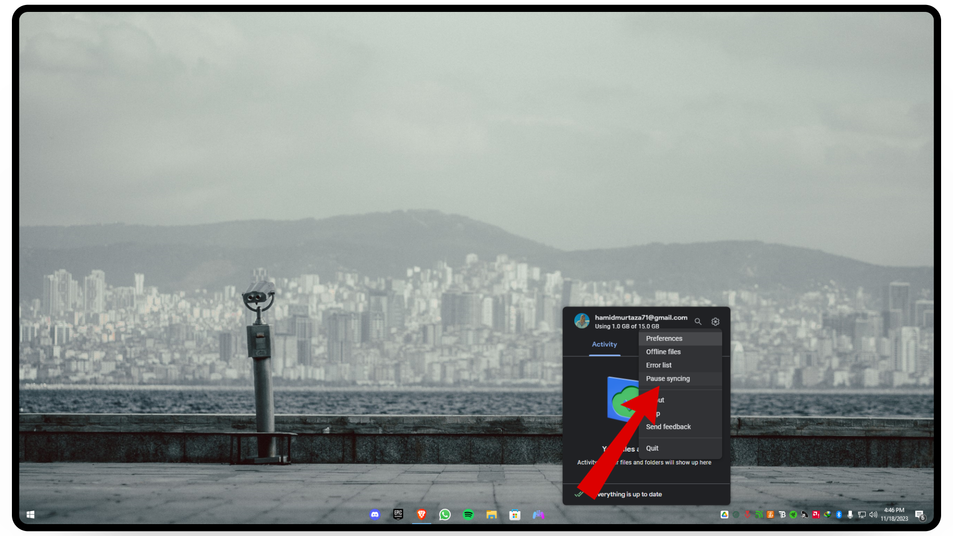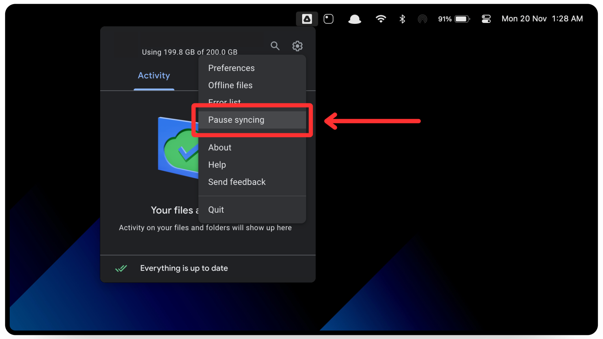 Click on the gear icon - Finally, click on the Pause syncing option.