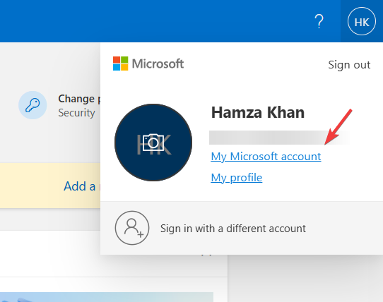 - Click the profile icon in the top-right corner and select My Microsoft account.
