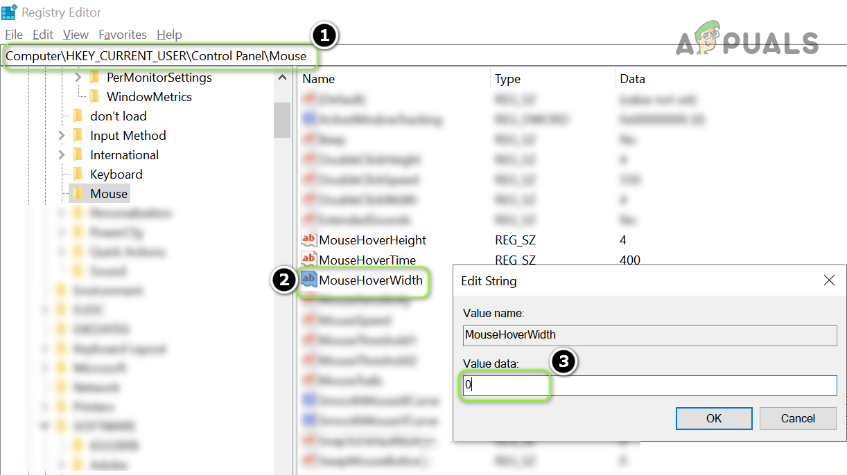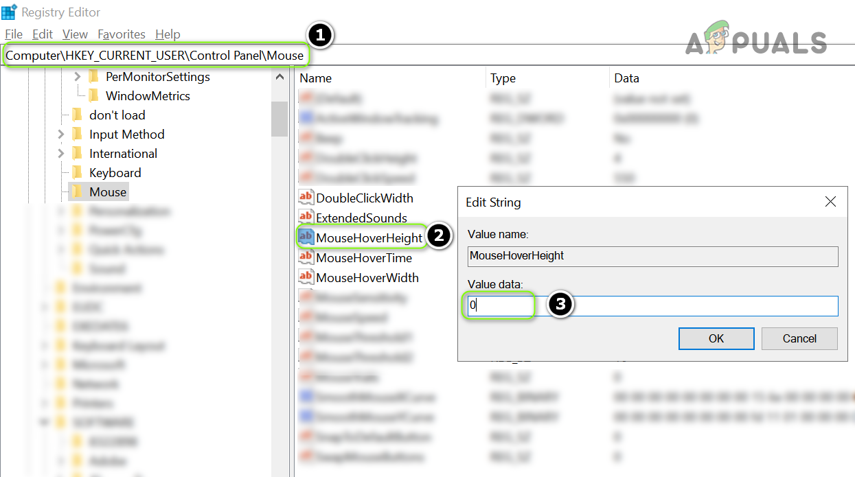 Set the Value of MouseHoverHeight to 0 in the Registry Editor - Now repeat the same to set the value of MouseHoverWidth to 0 and close the editor.