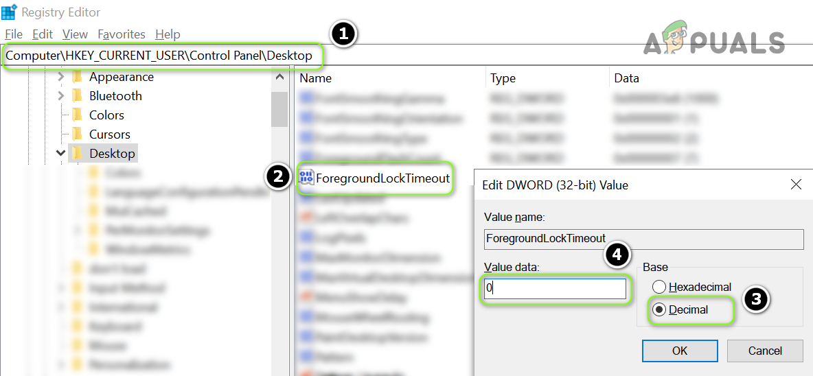 Change the Base of ForegroundLockTimeout to Decimal and Set its Value to 0 - Now click on the OK button and exit the editor.