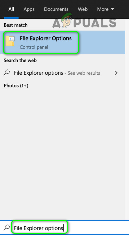 - Click on the Start menu button and in the search box, type: File Explorer Options. Then open the File Explorer Options in the results.