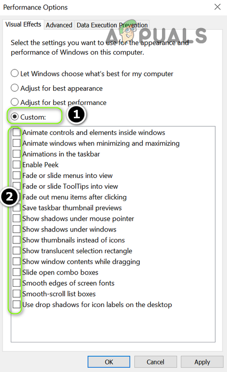 Choose Custom and Uncheck All the Visual Effects - If so, enable the options one by one till you find the one which triggers the issue. Once found, keep that option disabled. Some users have reported that keeping animation-related options disabled solved the problem.