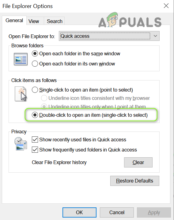 Open the File Explorer Options - Now, in the General tab, select the radio button of Double-Click on Open an Item (Single-Click to Select) and apply your changes.