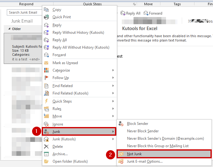 - Alternatively, after selecting the email, right-click on it, navigate to Junk, and then select “Not Junk“.