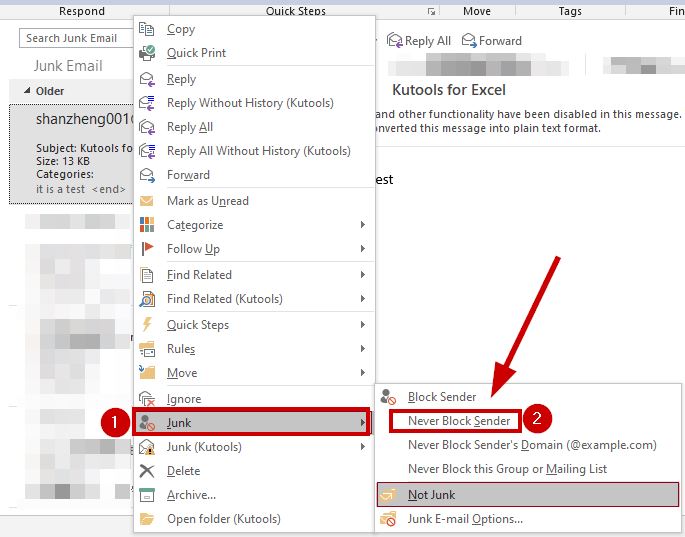 To stop Outlook from sending legitimate emails to the junk folder, you can mark them as ‘Not Junk.’ This action adds the sender’s address to the trusted sender list.