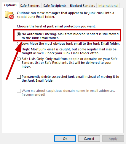 - Select the No Automatic Filtering option. Note that emails from blocked senders will still go to the Junk E-mail folder.