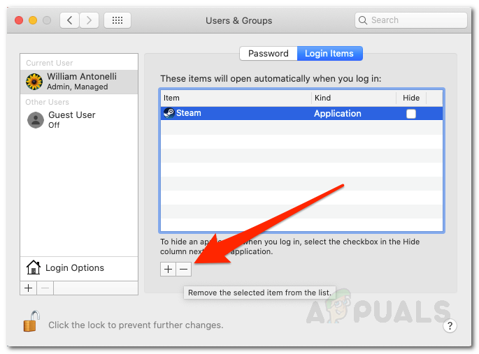 - Select the Steam entry from the list and then click the ‘–‘ button at the bottom left to remove it from the startup items.