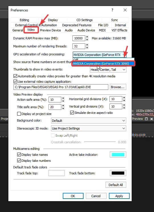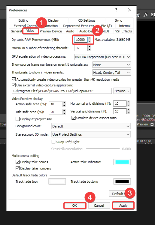 - Select Video from the top, and increase the RAM Preview Max to one-third of your RAM. For example, if you have 32 GB RAM, you can increase it to 10000 MB, which equals 10 GB.