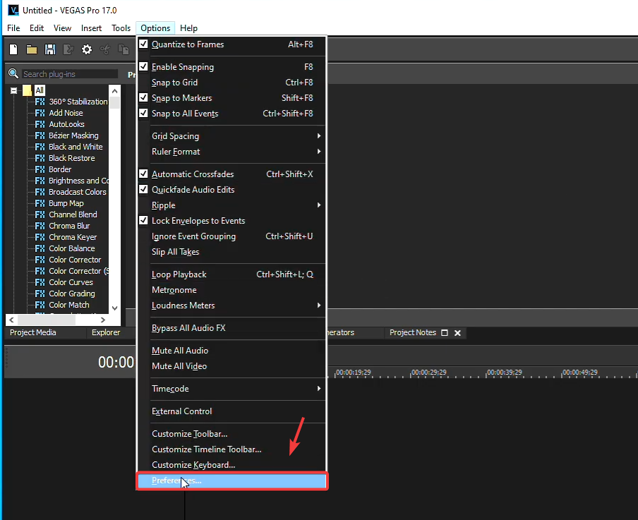- In Vegas Pro, click Options from the top menu.