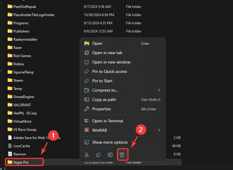 - Navigate to the Local folder and delete the folder named Vegas Pro.
