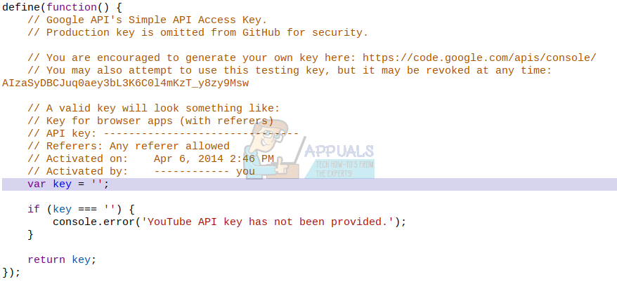 4. You will have to find the line highlighted in the screenshot above. Under var key =’’, insert the key we created earlier between the empty quotation marks. The final result should look like this