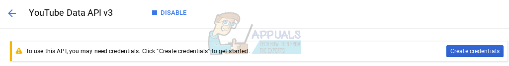 8. Once you enable the API, Google will prompt you to Create Credentials to use the API, which is exactly what we want to do.  Go ahead and click ‘Create Credentials’ on the message that appears once you click ‘Enable’.
