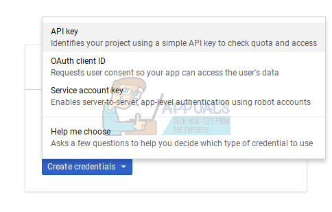 9. When you click on ‘Create Credentials’, a drop-down will prompt you to select what type of credential you want to create. Select ‘API key’ from the given options.