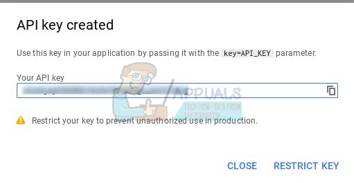 10. A window will appear with your API key, which you will have to copy and keep somewhere. (Do not share this key with anybody else)