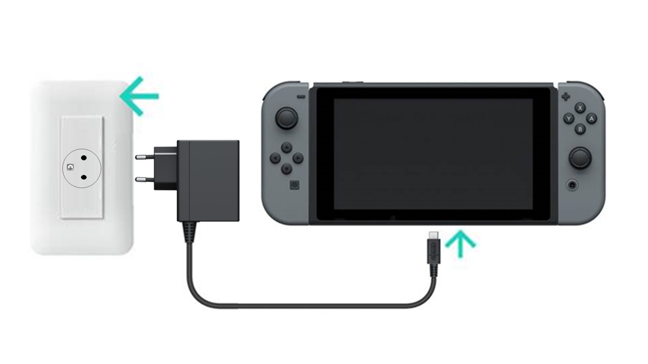 - While the Switch is in handheld mode, attach the AC adapter directly to the console and plug it into a wall outlet. If there is no display, press the Power button on the console.