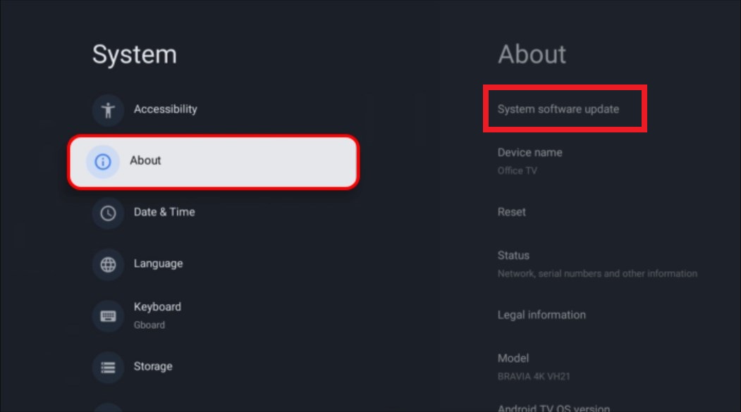 - Click on “System Software Update.” The TV will look for newer software versions and install them to your system automatically.