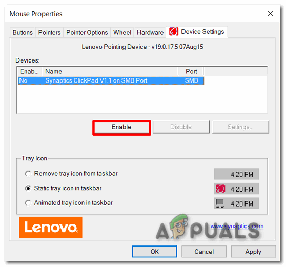 - Click on the Synaptics TouchPad and see it is enabled or disabled if it’s disabled proceed to enable the option.