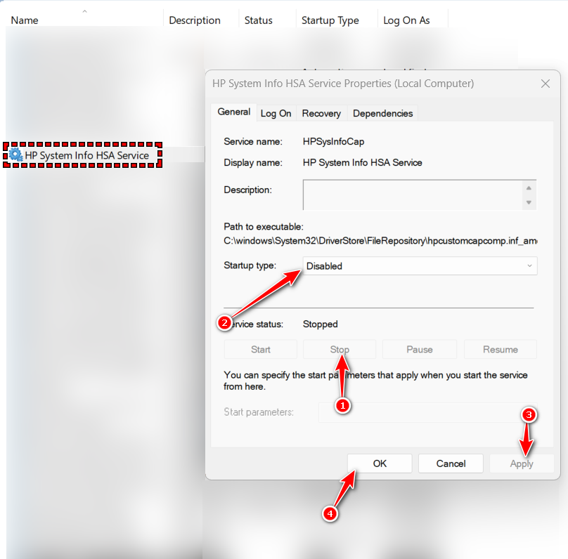 Disabling the HP System Info or HSA service through services.msc stops the process from launching automatically during startup. This prevents SysInfoCap.exe from running unnecessarily and eliminates the loop that causes high memory consumption.