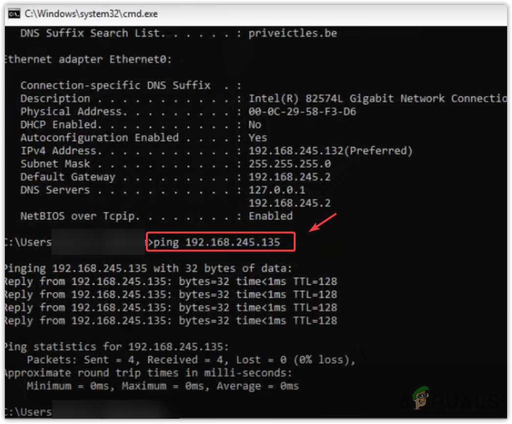 Having pinged the DC, the next step is to try pinging the affected device from the DC to ensure connectivity.