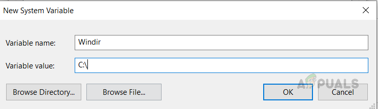 Click New under System Variables - In the Variable Name enter “windir” and in the Variable Value enter “C:\Windows” (The path to the directory where you installed Windows)