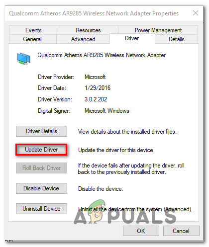 Accessing the Properties screen of the Network Adapter - Once you’re inside the properties screen of your Network adapter, select the Driver tab from the list at the top, then click on Update driver from the list of available options.