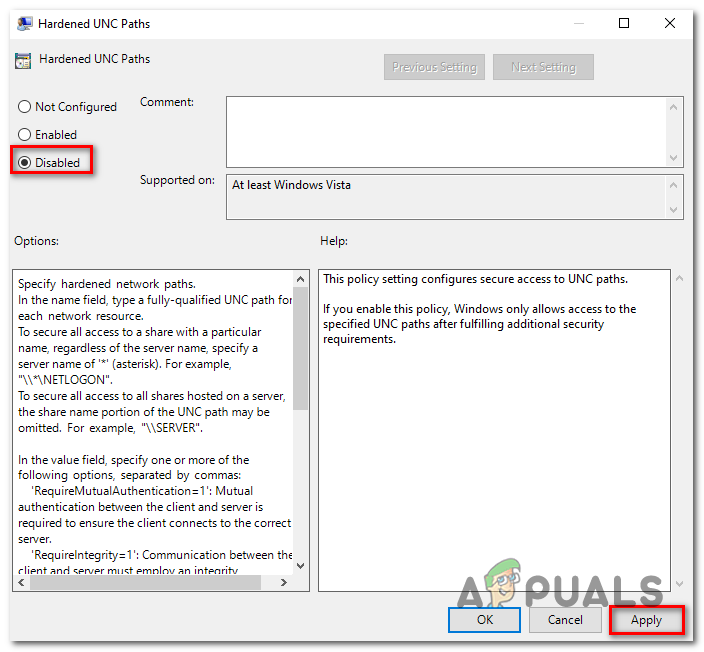 Accessing the Hardened UNC paths policy - Inside the Hardened UNC Paths windows, change it’s status to Disabled and click Apply to save the changes.