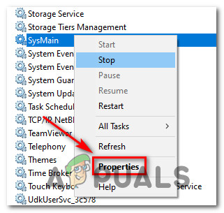 Accessing the Properties screen of Sysmain - Inside the Properties screen of SysMain, click on the General tab, then set the Startup type to Disabled by using the associated drop-down menu. Then, click on Stop if the service is already running.