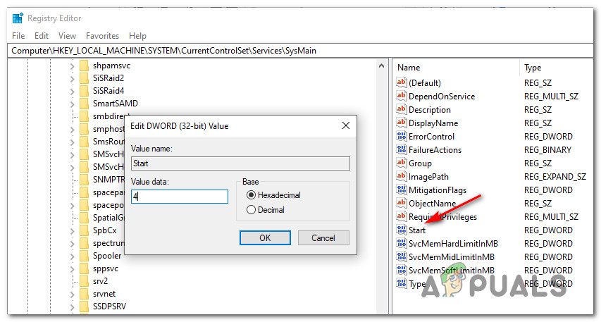 - Finally, set the value data of Start to 4 and the Base to Hexadecimal before clicking on Ok to save the changes.