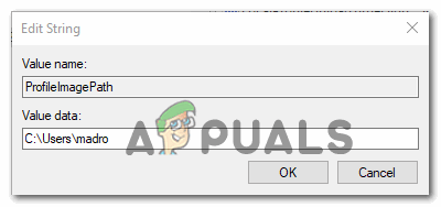 Selecting the correct sub-key from ProfileList key - Once you’ve selected the correct sub-key, move over to the right-hand side section and double-click on ProfileImagepath. If that path points towards C:\Users\DefaultUser0, change it to point towards the primary profile that you’re using.