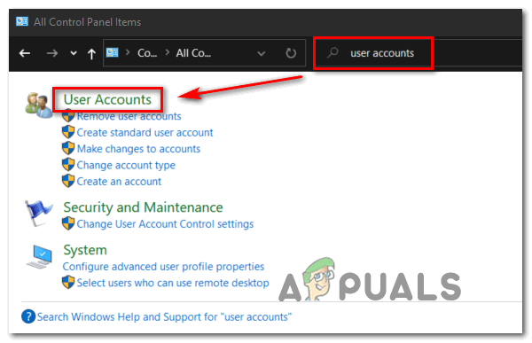 - From the list of results, click on Remove User accounts (under User Accounts).