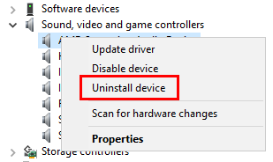 - In Device Manager, expand Sound, video, and game controllers. Right-click on every driver and then select Uninstall device.