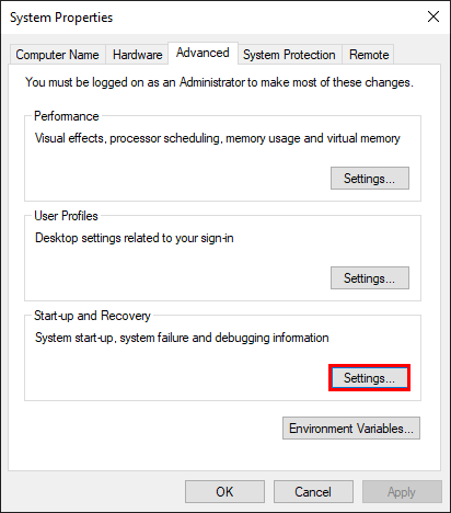 - In Advanced tab, under Startup and Recovery, click on Settings.