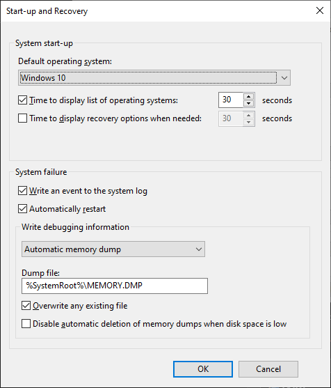 - Under Write Debugging Information, choose the type of information you want Windows to save in a memory dump file in case the computer stops unexpectedly.