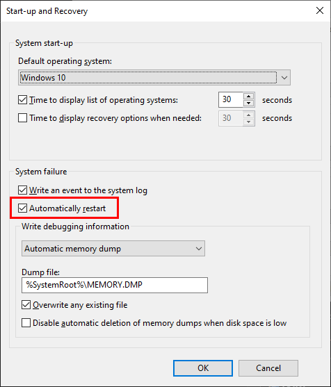 - The Automatically restart option implies that Windows will restart your computer automatically. By default, this option is turned on. To disable this option via modifying the registry, type the following at a command prompt and then press ENTER:
