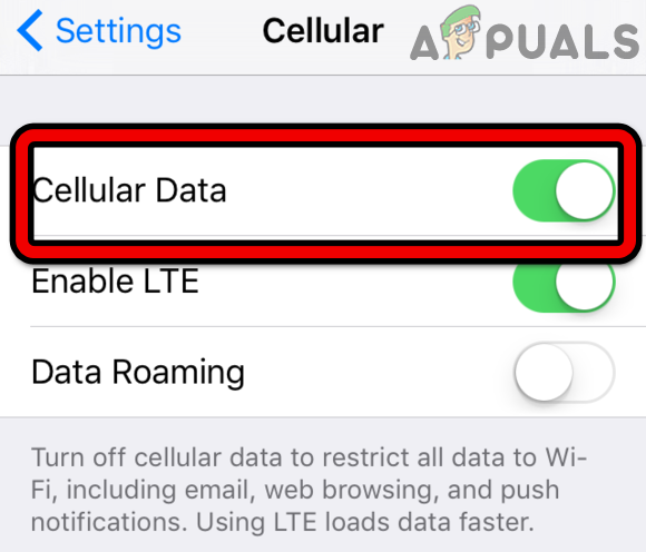Disable Cellular Data on iPhone - If the issue persists, check if enabling back the cellular data clears the error.