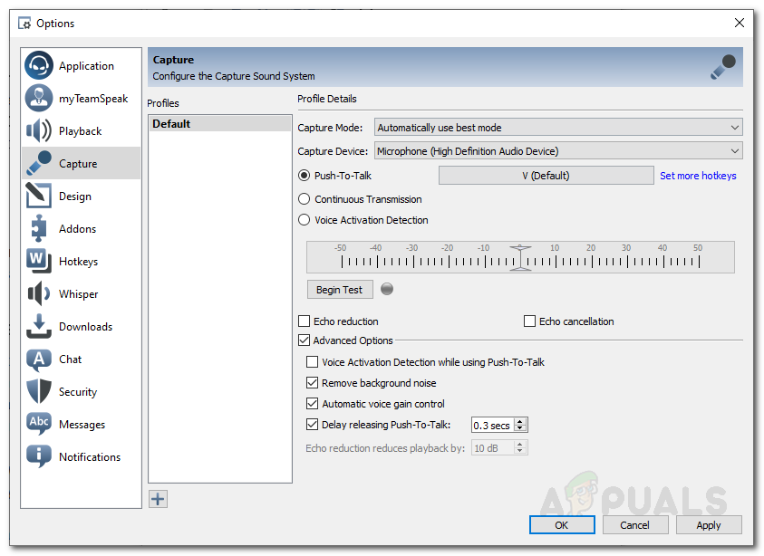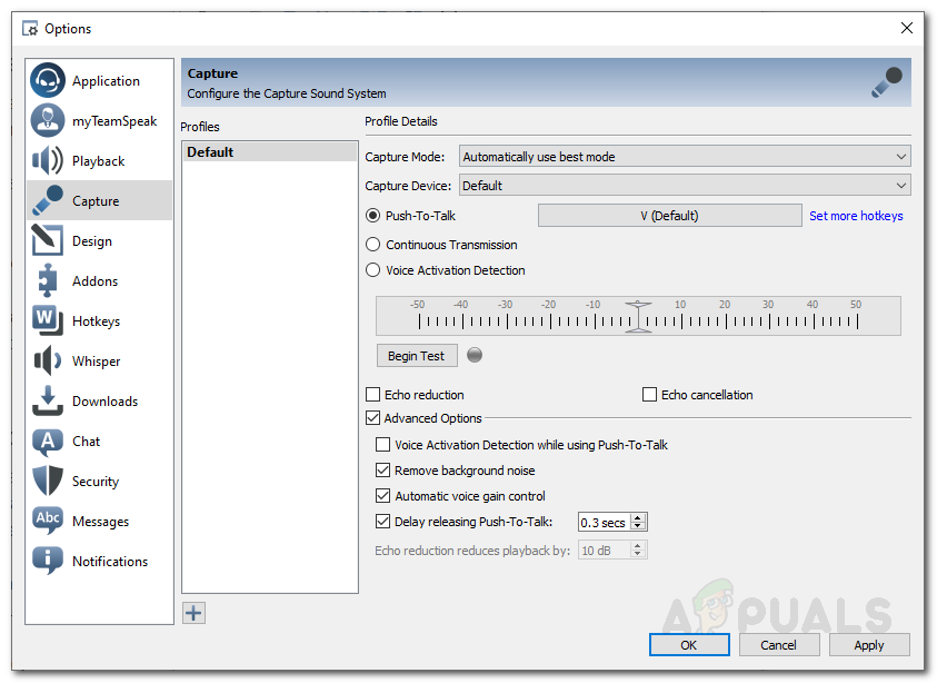 The push to talk fails to work when you do not have the right capture or hotkey profile selected. This implies when you try to talk using your push to talk hotkey, your mic does not detect anything as it has not been enabled. Thus, the push to talk feature does not work and your friends are not able to hear you. Usually, it so happens that the capture profile resets to the default option when you have configured it to use another device. This phenomenon can occur when you try to connect to a different server or when you launch Teamspeak after rebooting/shutting down your system.