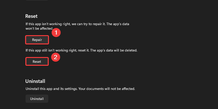 If the problem persists, try repairing or resetting Microsoft Outlook and Microsoft Teams. Repairing these applications can fix potentially corrupted files. If this doesn’t resolve the issue, resetting the applications may help by removing problematic cache files and deleting the application’s data.