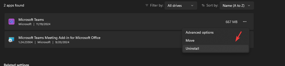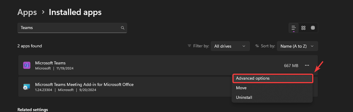 - Locate Microsoft Teams, click the three dots next to it, and select Advanced Options.