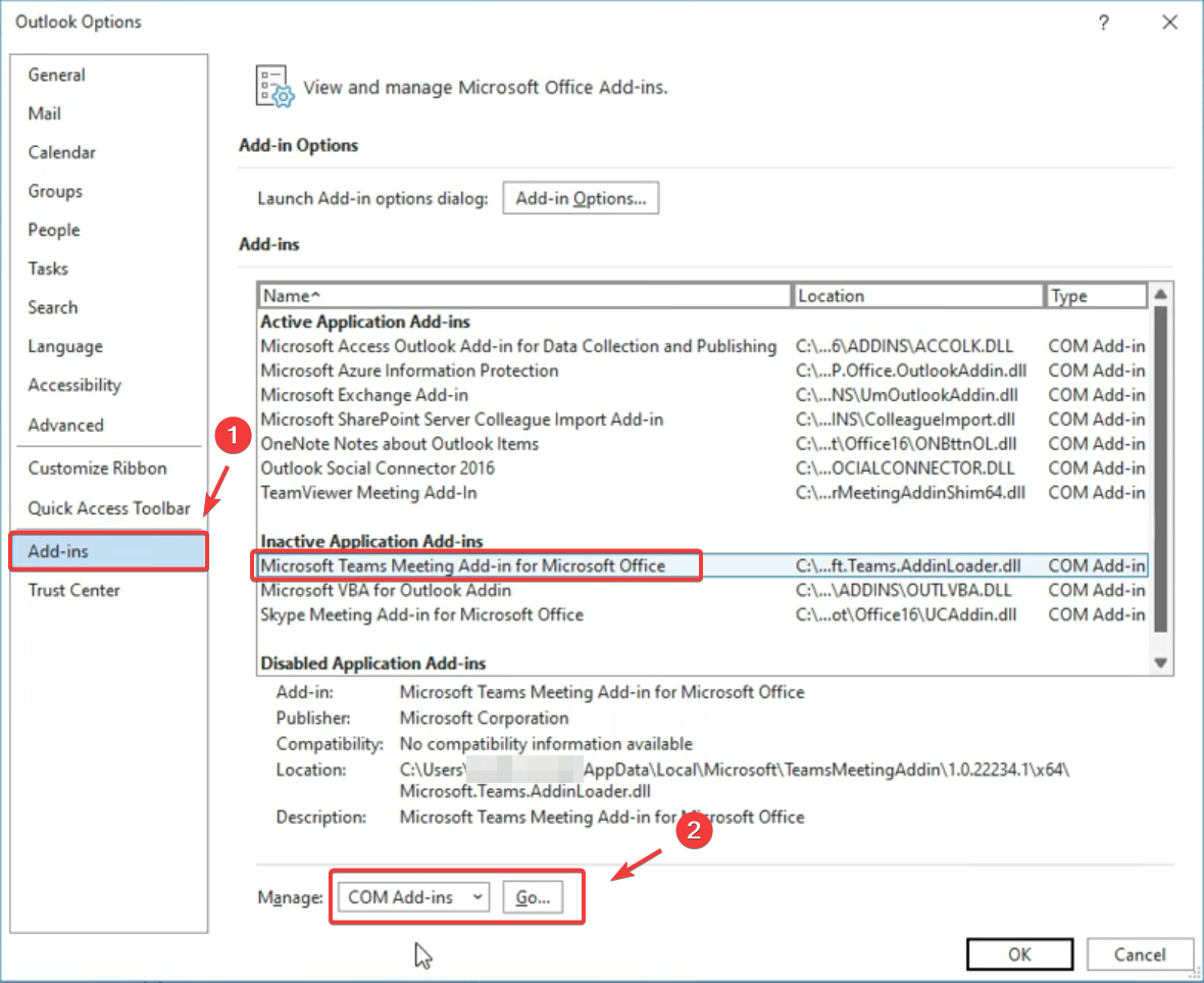 - Check if the Microsoft Teams Meeting Add-in for Microsoft Office is listed under Inactive Application Add-ins or Disabled Application Add-ins.