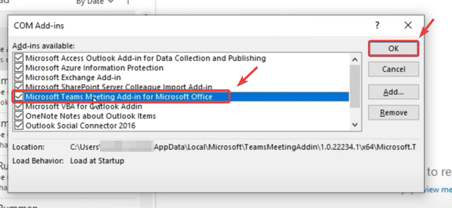 - Check the box for Microsoft Teams Meeting Add-in for Microsoft Office, then click OK.