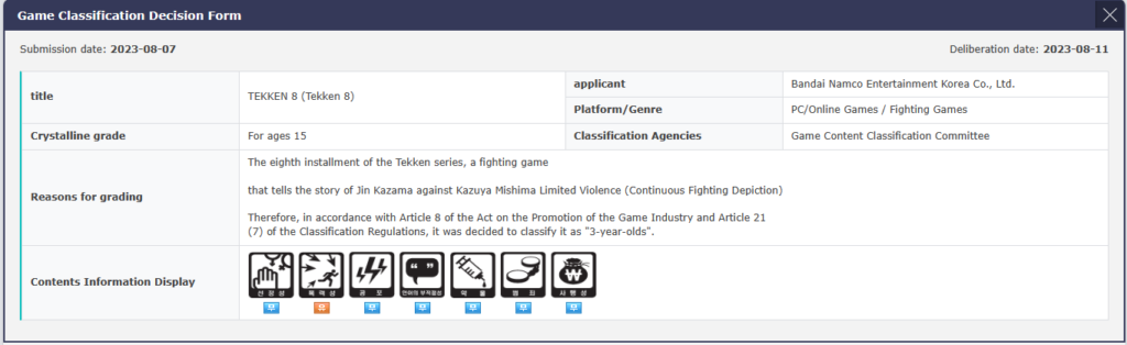 Earlier this week, on August 11th, the Game Rating and Administration Committee of Korea had rated the PC version of Tekken 8 for ages 15 and above. The listing showed nothing out of the ordinary, with the applicant being Bandai Namco, and the genre “Fighting Games.”