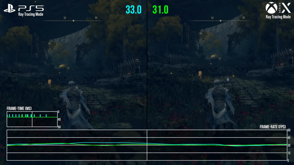 Now, see the image below showing a more recent and much more demanding title “Elden Ring” running on both consoles. Once again, you see how the PS5 actually runs the game ever so slightly better here with more consistently higher FPS, proving that its 10.3 TFLOPS GPU (much like every other GPU) is not indicative of real-world performance.