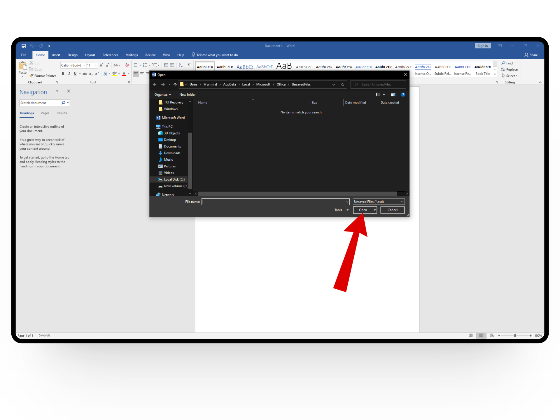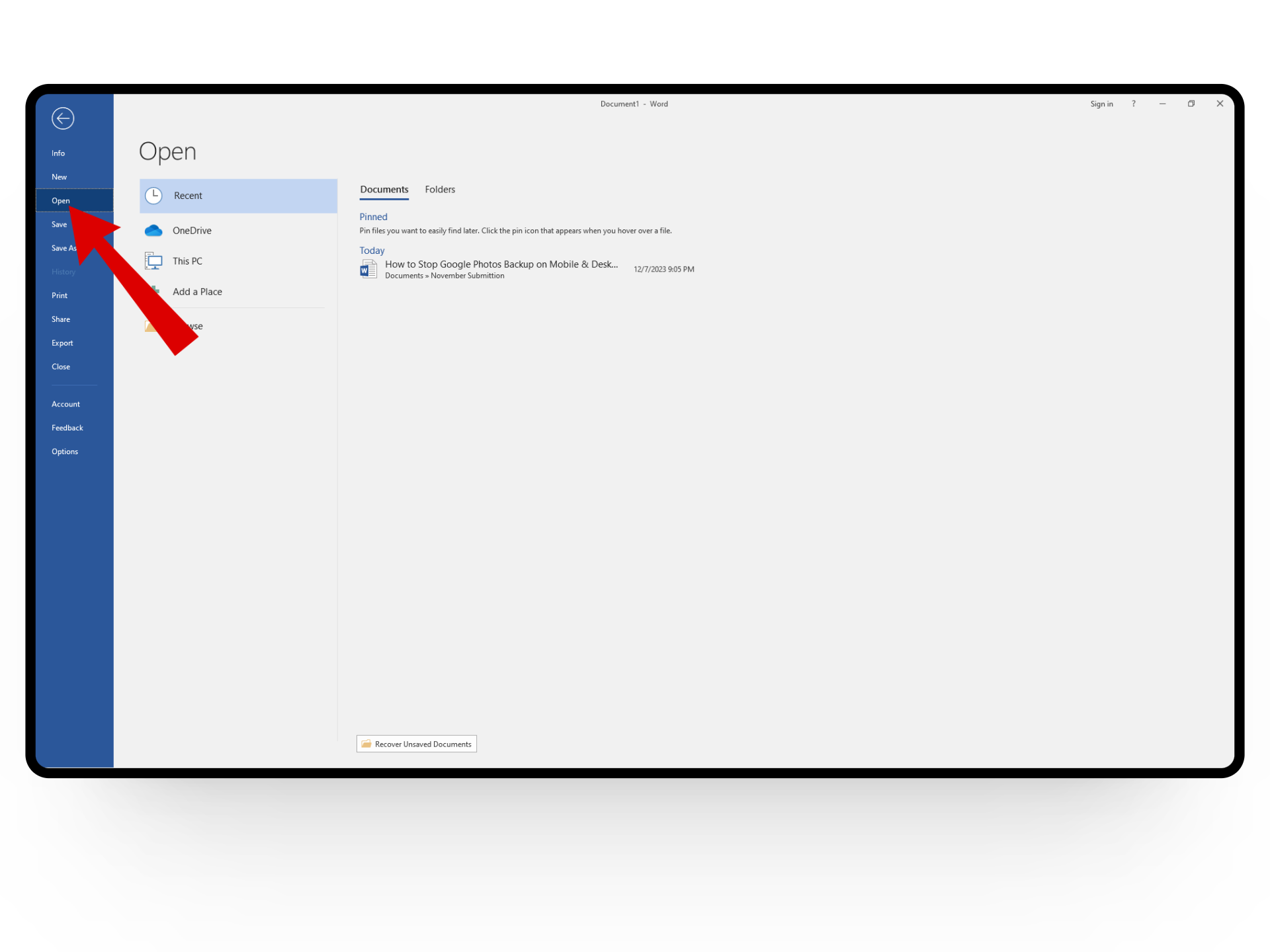 Head to the open tab - From here, click on the Recover Unsaved Documents button at the bottom of your documents screen.