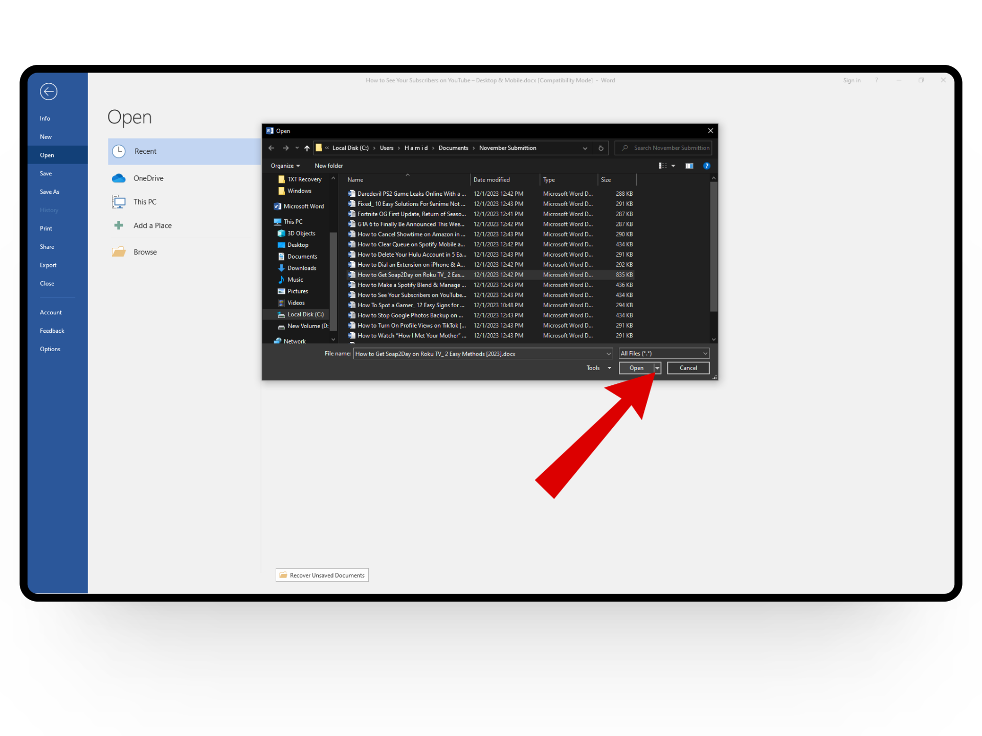 Unlike ours your folder should contain your documents - Now, choose the most recent version and click on Open.
