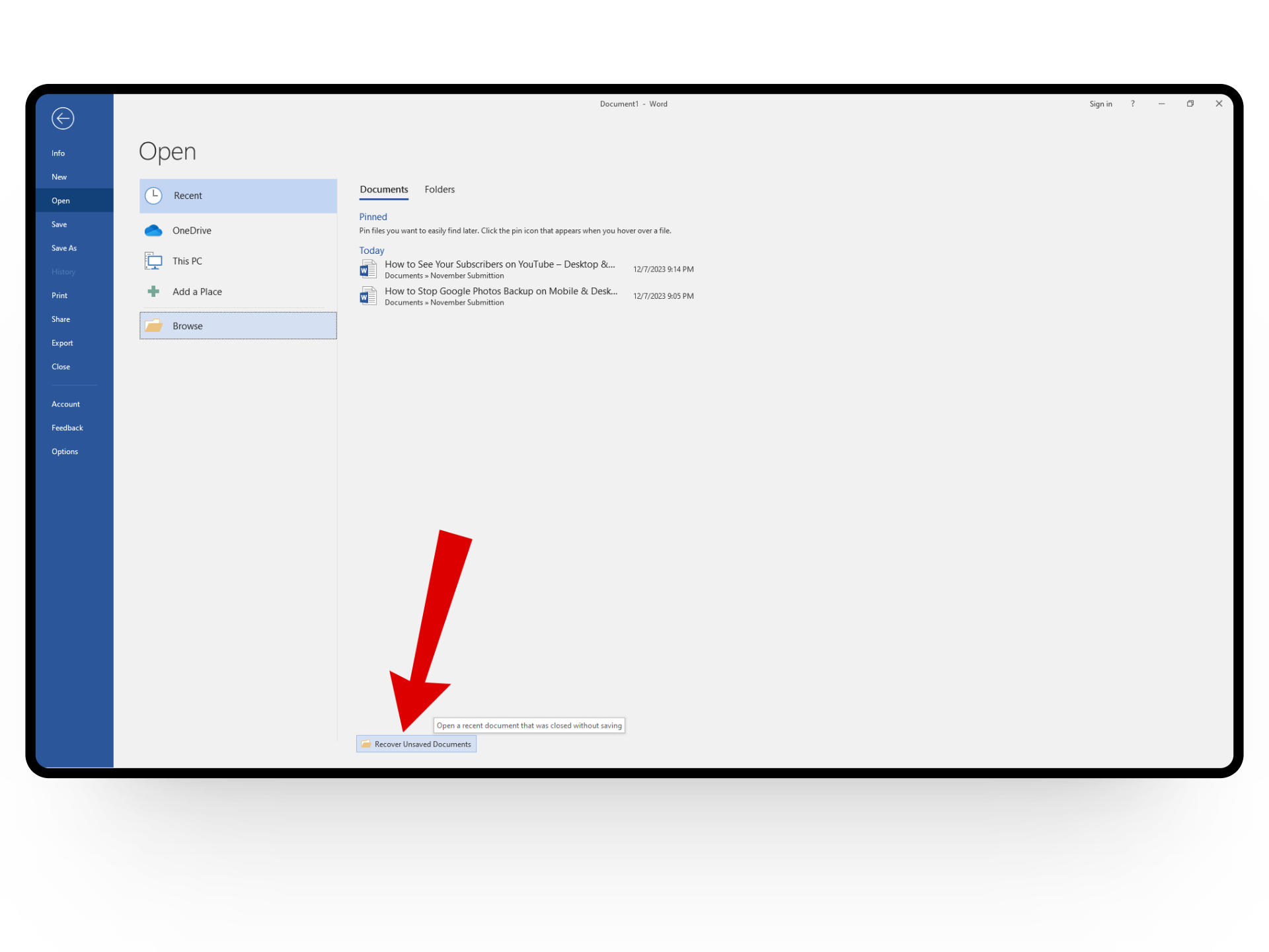 - Recover Unsaved Documents: This feature is only for recent corrupted documents and can allow users to open up auto-saves of their document’s previous versions.