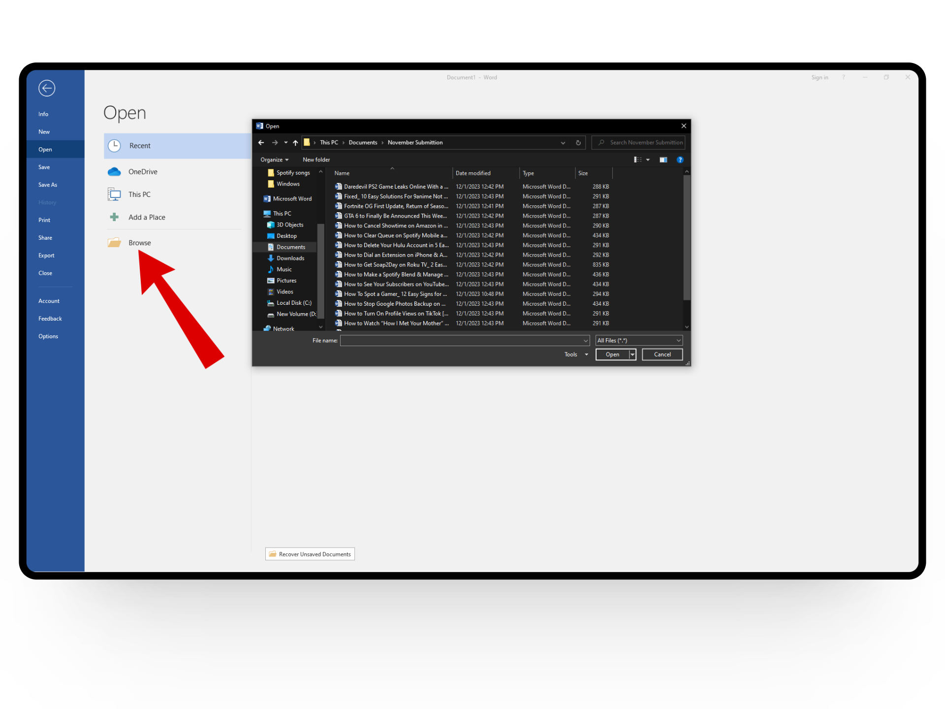 Head over to the open tab - Next, click on the Browse option to open the file locater.